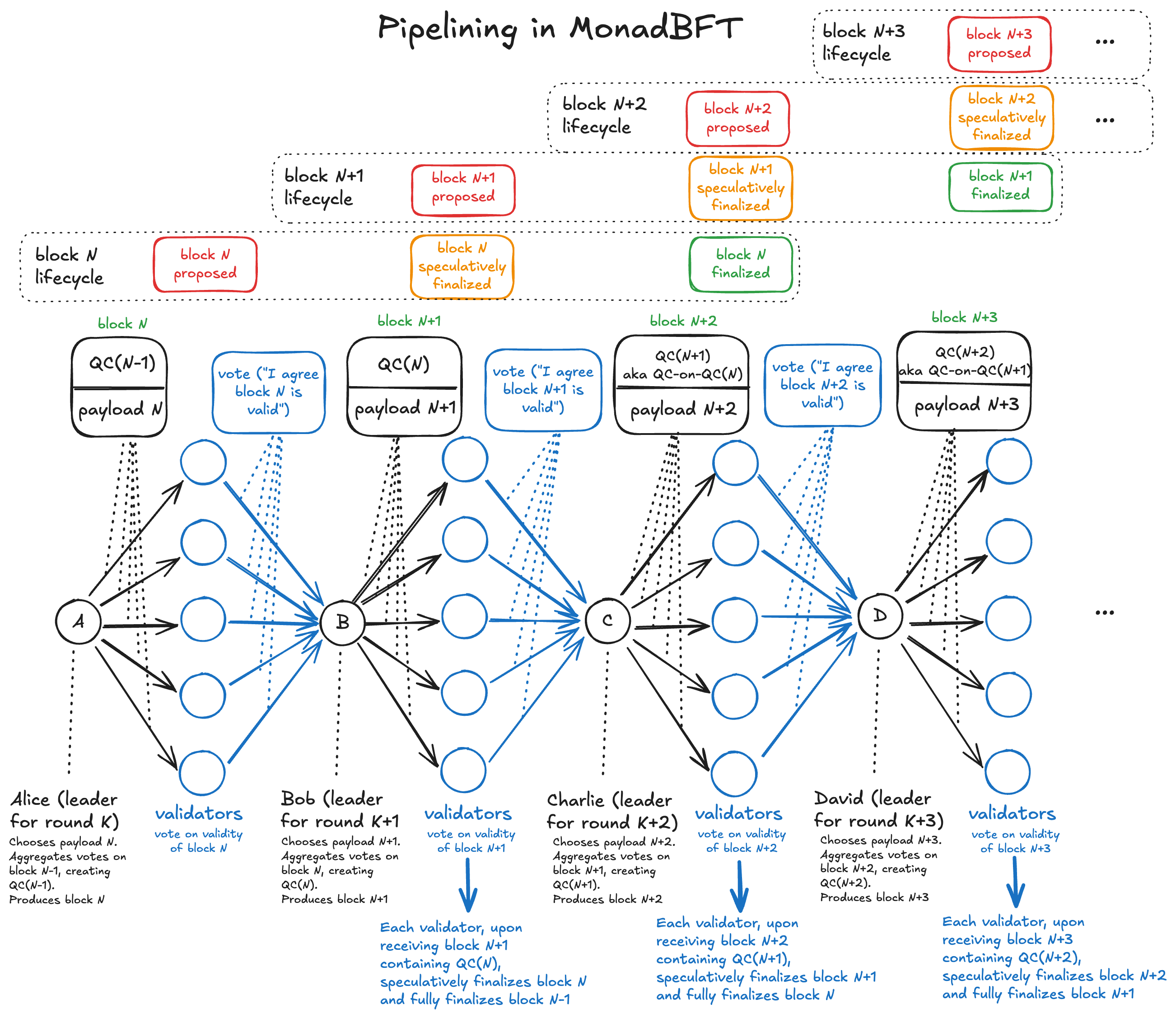 K+2, and marks blockNasVoted(and blockN+1asProposed.)This also means that the block can be speculatively finalized. This speculative finality will only revert under very specific rare conditions, which also come with accountability. More on this later.