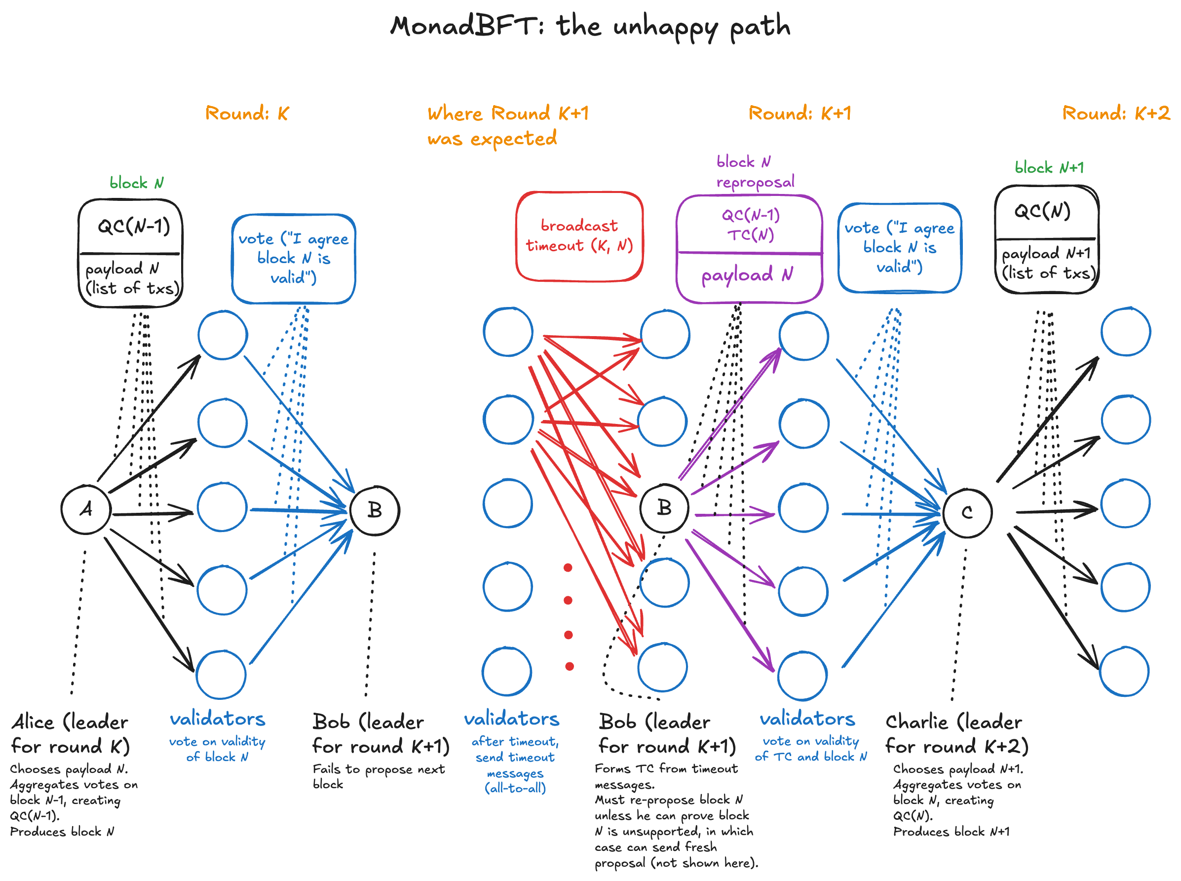 In prior implementations of pipelined HotStuff-family consensus protocols, the case where Bob misses his slot results in Alice's proposal also being rolled back (tail forked). The intuition behind this is: Bob is the only person responsible for receiving everyone's votes on Alice's proposal, so when he goes offline, all of those votes are blackholed, making it hard to distinguish between the case where most validators voted YES for Alice's proposal and the case where most validators rejected her proposal.